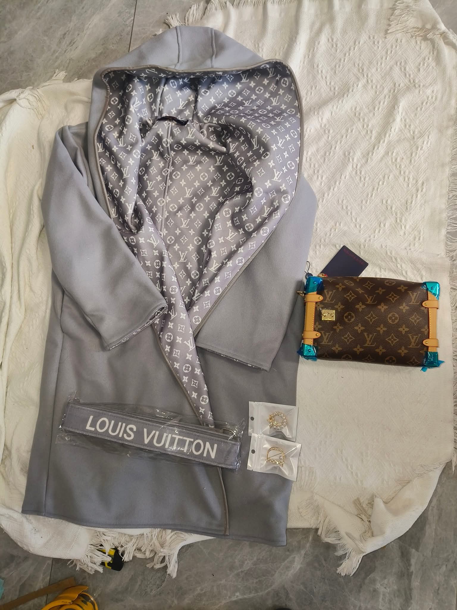 Keep it clean this season with our new Soft Grey Monogram Wrap Coat. The perfect balance of cozy and chic, featuring that signature interior print that elevates the whole fit.
