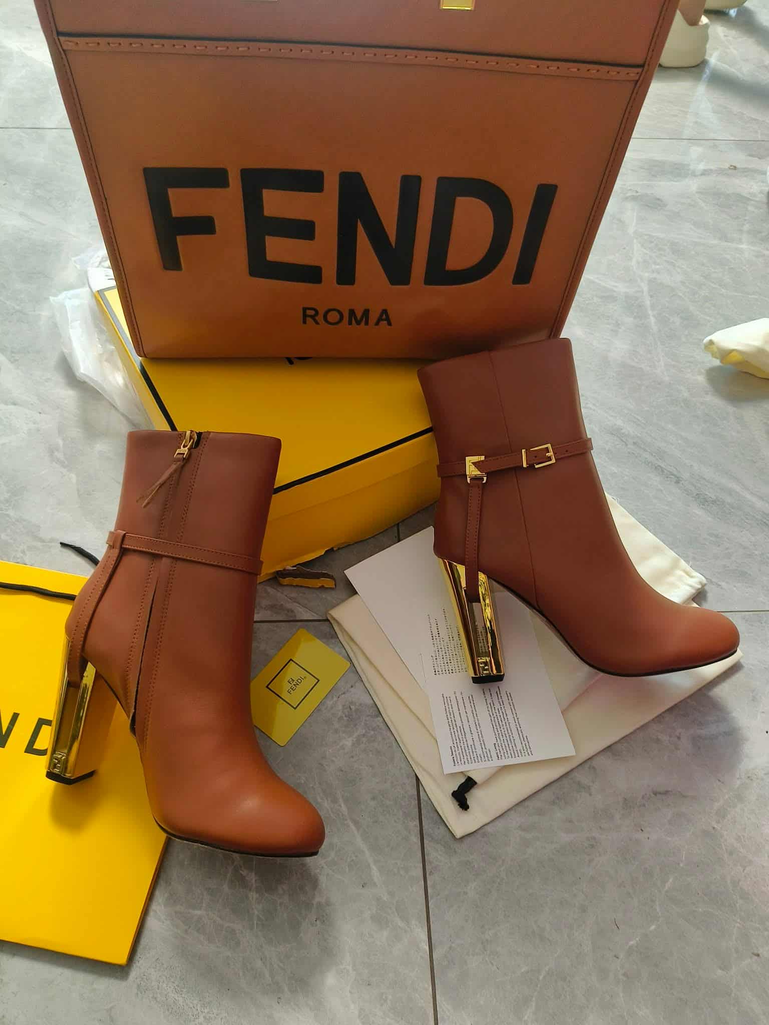 The Details: 🔸 Smooth Cognac finish 🔸 Statement gold-plated heels 🔸 Spacious "Roma" Tote